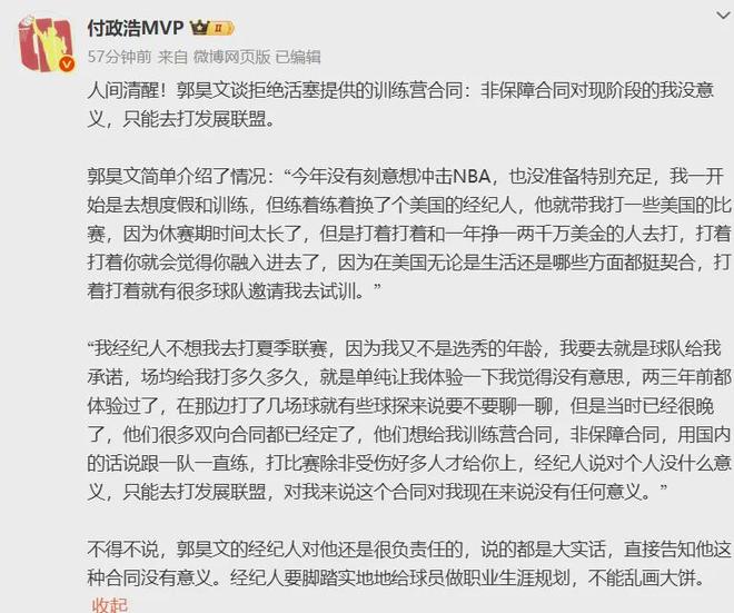 近日接受采访,郭昊文首次谈及拒绝NBA球队活塞,表示:“那个合同没有保障,只是训练营合同,只能去打发展联盟,很难在正赛登场亮相。”