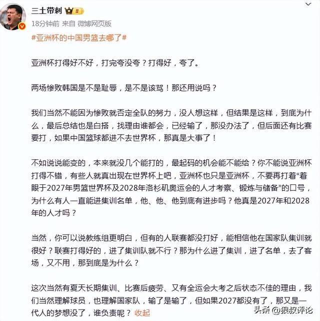 这次当然有夏天长期集训、比赛后疲劳、又有全运会大考之后状态不佳的理由,我们当然理解球员,也理解国家队,输了是输了,但如果2027都没有了,那又是一代人的梦想没了,谁负责呢?”