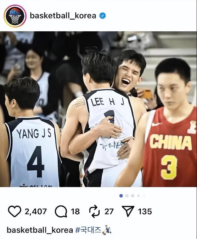 韩国连续两战击败中国,还是在人员不齐整、连教练都是临时找的情况下做到的,让韩国篮协十分得意。在大胜中国男篮后,韩国篮协晒出庆祝照片,除了有得意洋洋的韩国球员外,中国男篮主力后卫胡明轩也在其中,甚至可以说韩国是特意找出这张照片的,以示你们胡明轩看来也是韩国男篮的一员,毕竟没有他,韩国庆祝宴都不敢开席!胡明轩两战韩国,一共15投0中,这种表现确实不应该!