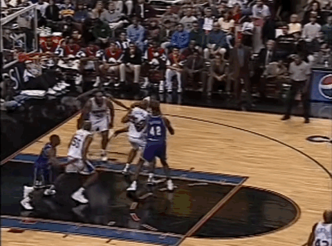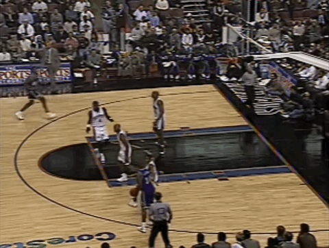 半场结束时,76人落后雄鹿7分。易边再战,艾弗森看上去逐渐适应了比赛节奏,他在阵地战中愈发活跃:先是通过手递手飙进三分,那个赛季他很快成为联盟排名前列的三分手;随后,随后又两次在底线区域觅得机会,一次补篮、一次空切,展现出敏锐的无球嗅觉。