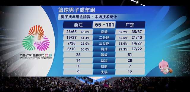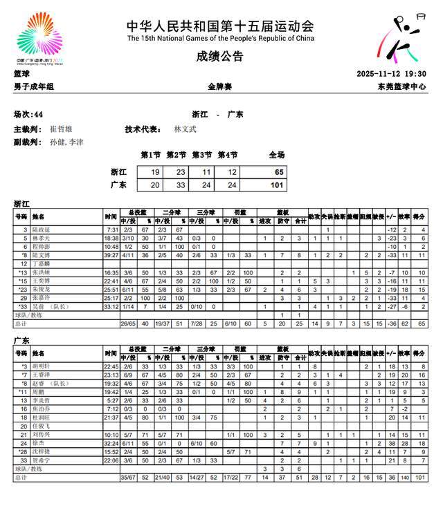 末节决战,随着杜润旺扔进3分,广东队把领先优势拉大到了30分,胜负的悬念彻底瓦解了。最终,广东全运男篮以101-65大胜浙江队36分,杜锋说到做到,如愿拿到了全运会男篮金牌,而浙江队则是屈居亚军,丁伟也算是超额完成任务了吧。