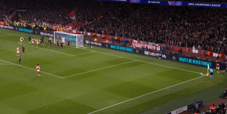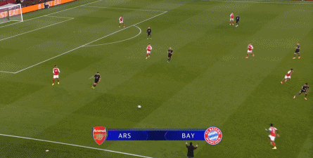 所以在上半场前半段,萨卡的表现依然过硬,但其他队友也有表现,从而在中场争夺中不落下风,到了第21分钟,萨卡和队友一起制造拜仁的后场混乱,从而制造了球队擅长的定位球,萨卡主罚,队友顶进: