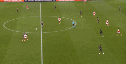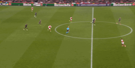 但在丢球之后,在阿森纳的站位没那么保守的时候,通过斜长传还是可以打出机会,格纳布里和小将卡尔一起传跑,从而扳平了比分: